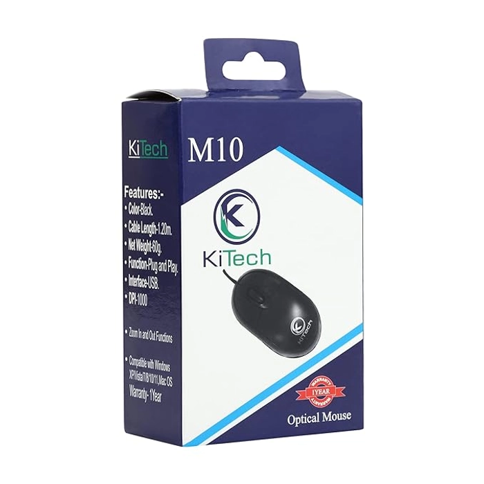 Introducing the KITECH M10 Wired Optical Mouse in sleek black. This ergonomic and stylish mouse is the perfect companion for all your computing needs. With its USB 2.0 connectivity, you can easily connect it to your laptop or desktop computer for effortless navigation.